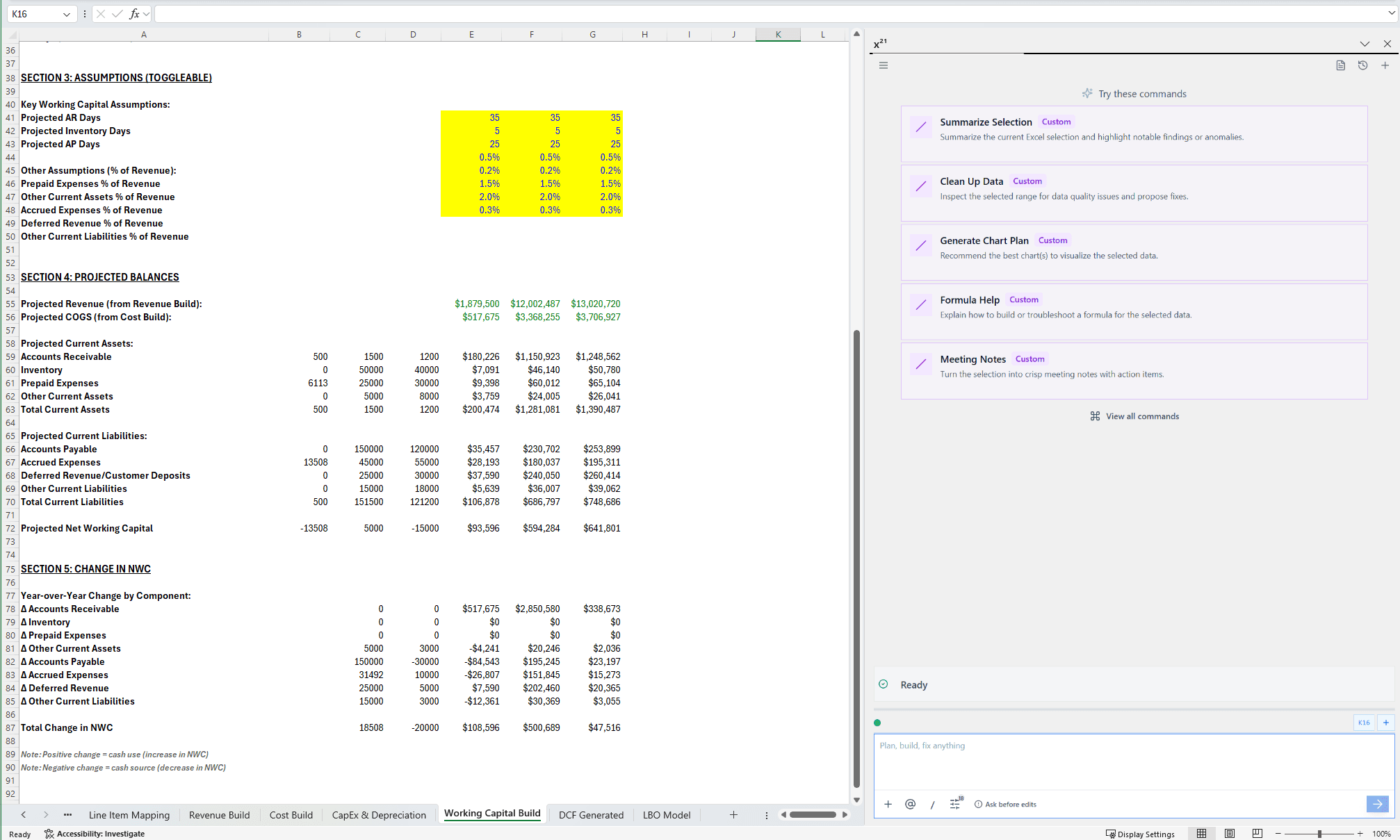 Problem: The NWC schedule is a core deliverable—components, days metrics, trend analysis, normalization flags. Building it right takes time, and it needs to hold up to buyer scrutiny.